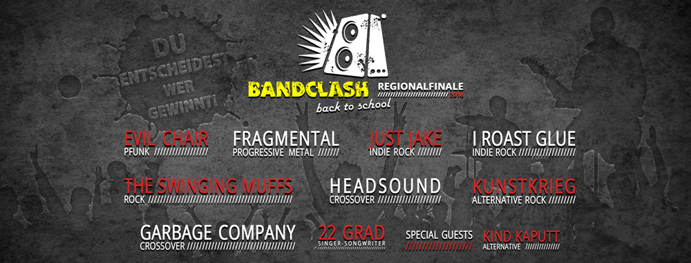 Mit neun Bands ging der Abend für das Publikum ins Rennen. Ab 19:00 Uhr öffneten die Tore der Tante Ju bis kurz vor Beginn war eine lange Schlange prägendes Bild, der Zuspruch war hoch und so kamen zahlreiche Gäste zum Event. Mit den Darbietungen von I Roast Glue, The Swinging Muffs und 22 Grad kam die Veranstaltung in fahrt und bewies ihr hohes Niveu. Die Künstler von Kunstkrieg brachten die Stimmung dann noch ein Schritt nach vorn. Bestens aufgelegt folgte Headsound, die neben dem Publikum auch die Juryherzen zum kochen gebracht haben. Evil Chair folgte der Welle und konnte vor allem beim Publikum, die meisten Punkte für sich gewinnen. Just Jake und Fragmental waren hausgemacht und überzeugten mit ihren Varianten. Die abschließende Band Garbage Company konnte aufgrund eine künstlerischen super performance des Sängers und seiner Band den Saal für sich gewinnen.