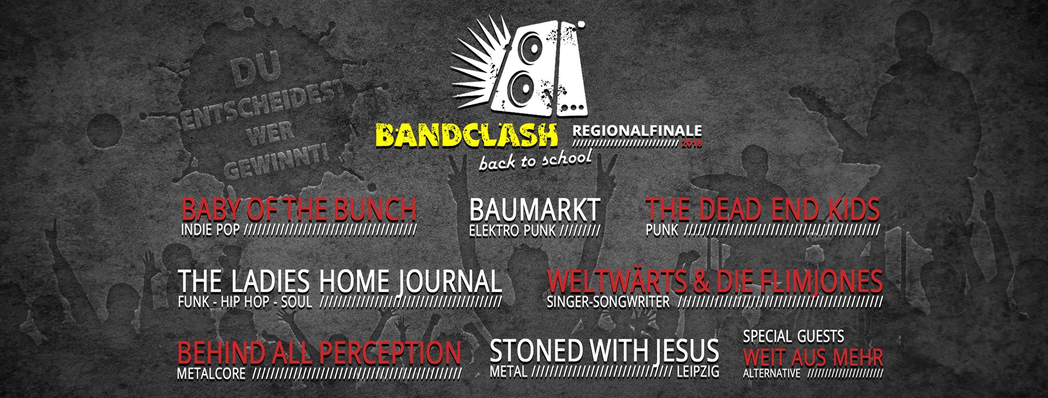 Leipzig konnte in der vollbesetzten Halle 5 beim Regionalausscheid West des Band Clash ein berauschendes Musikevent feiern. Gemeinsam mit dem Special Guest und 7 Wettbewerbsbands konnte der Abend viel Varianten verschiedenster Genre bieten, von Post Grunge über Indie und Singersongwriter hin zu Metal. Nach Juryvorstellung und Publikumseinweisung ging die Show pünktlich zur Primetime 20:15 mit Stoned with Jesus ins Rennen. Mit soliden Metalparts wurde das Publikum aufgeweckt. Baumarkt aus Chemnitz nutzte im folgenden die offenen Gedanken und verbreiteten allgemeines Chaos durch ihr experimentierfreudigen Satzgesang. Anschließend konnte die Gruppe The Dead End Kids, die ihre Wurzeln im Postgrunge finden aufspielen. Bühnenpräsenz und eine starke Stimme überzeugte vor allem die Jury von ihrer besonderen Art. Im Anschluss ging nach einheitlicher Meinung des Publikums Behind All Perception gut nach vorne, was bei Metalcore ein sehr positives Statement ist.